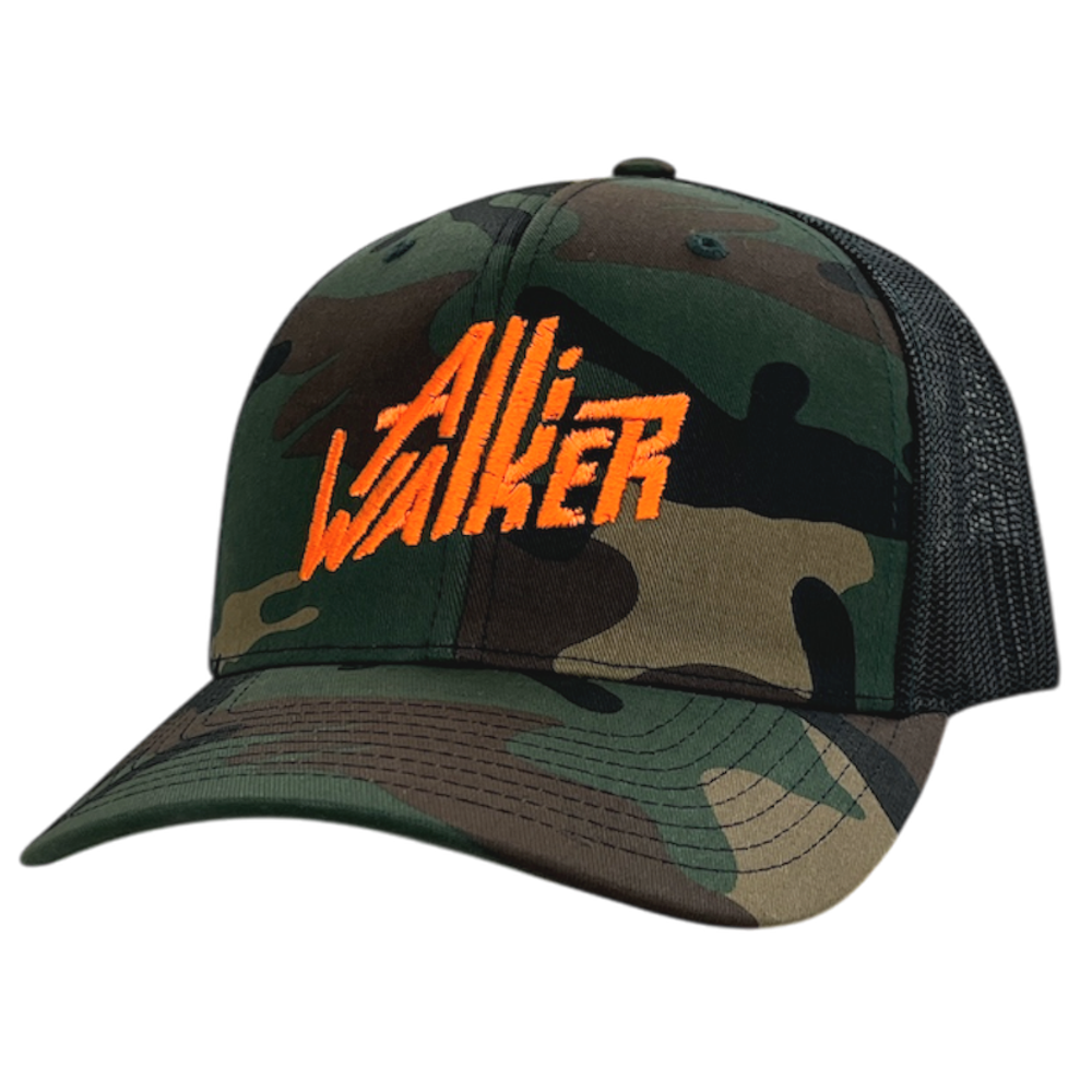 Low profile, constructed camo and black hat with Alli Walker embroidered on the front in safety orange.